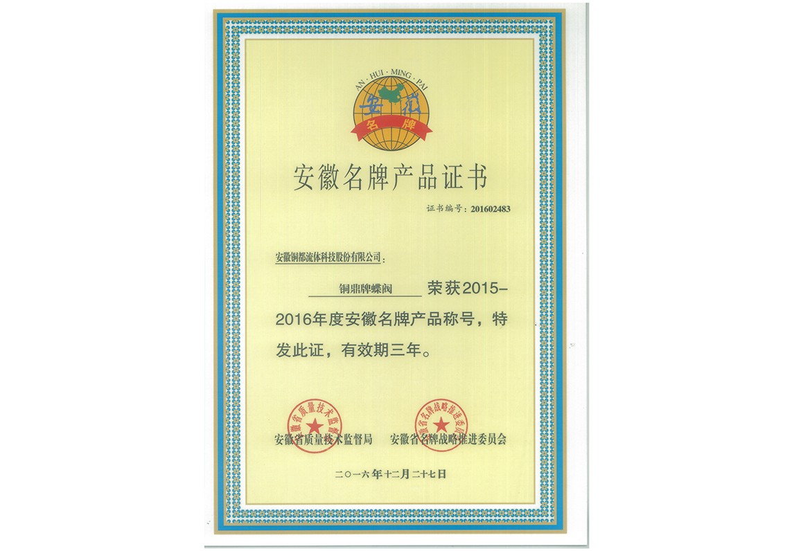 蝶閥-名牌產(chǎn)品證書