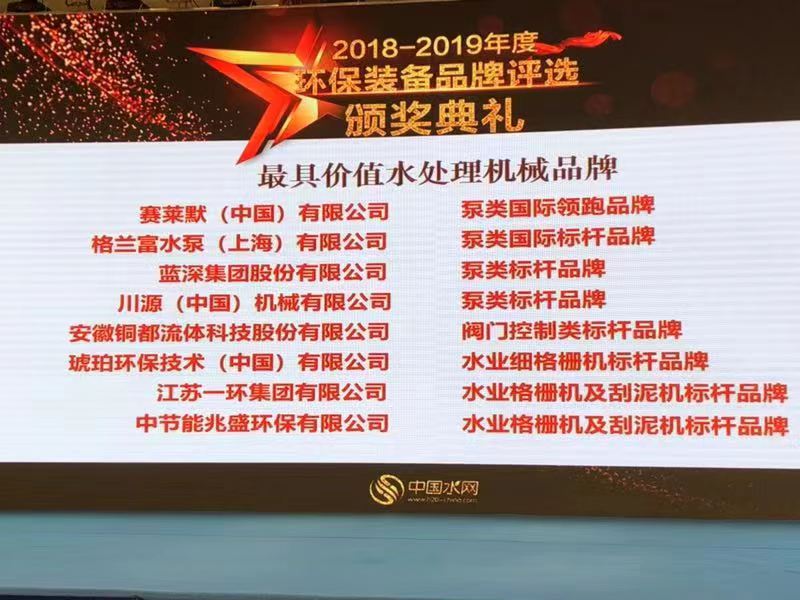 2019年8月17日,在上海舉辦的“2019(第十一屆)上海水業(yè)熱點(diǎn)論壇”暨“2018-2019年度價(jià)值環(huán)保裝備品牌”評選中,安徽銅都流體科技股份有限公司再次榮獲“2018-2019年度價(jià)值水處理機(jī)械品牌”。