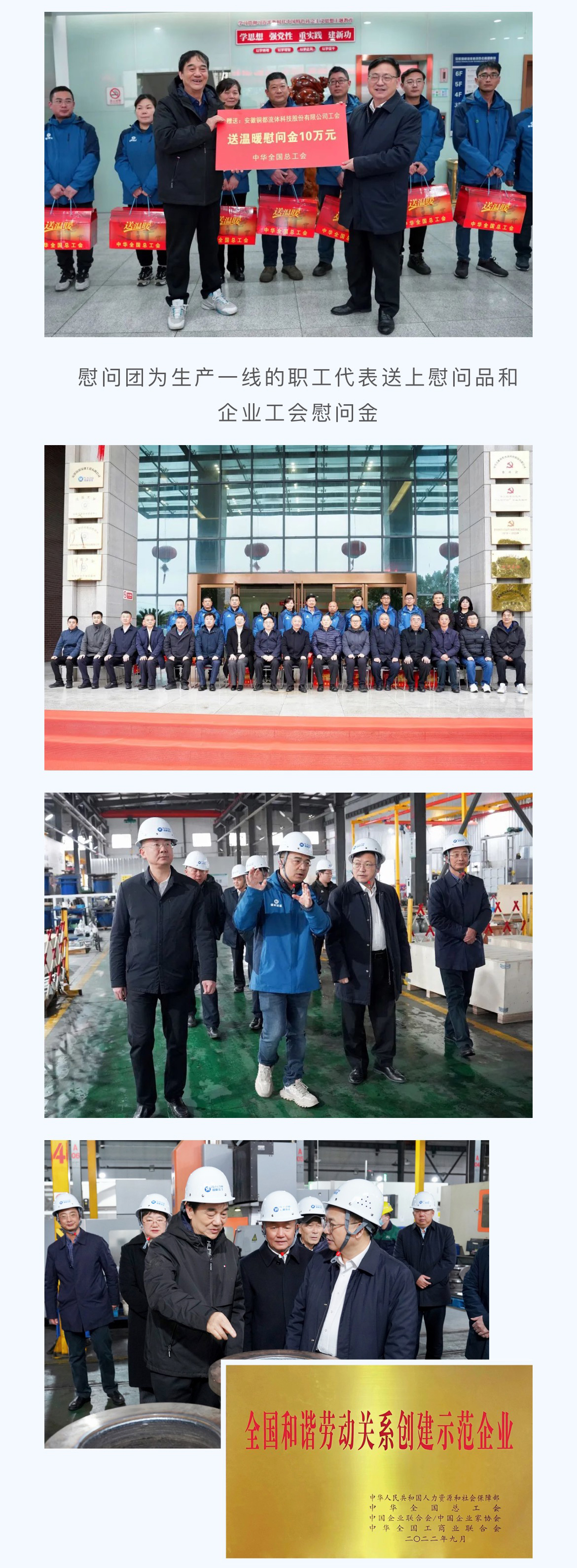 慰問團(tuán)一行對(duì)銅都流體獲得“全國和諧勞動(dòng)關(guān)系創(chuàng)建示范企業(yè)”榮譽(yù)作出充分肯定,并在董事長楊成、總經(jīng)理?xiàng)盍杞芘阃拢巴a(chǎn)現(xiàn)場(chǎng),看望奮戰(zhàn)在生產(chǎn)一線的職工代表,為他們送上慰問品和企業(yè)工會(huì)慰問金,詳細(xì)了解企業(yè)生產(chǎn)經(jīng)營和工會(huì)工作情況,指出企業(yè)工會(huì)組織要切實(shí)發(fā)揮作用,圍繞企業(yè)生產(chǎn),積極開展各類勞動(dòng)競(jìng)賽和技能素質(zhì)提升活動(dòng),為職工的成長成才搭建廣闊舞臺(tái),鼓勵(lì)廣大職工要充分發(fā)揮工人階級(jí)主力軍作用,用辛勤的勞動(dòng)創(chuàng)造美好的生活,為推進(jìn)中國式現(xiàn)代化貢獻(xiàn)自己的力量。