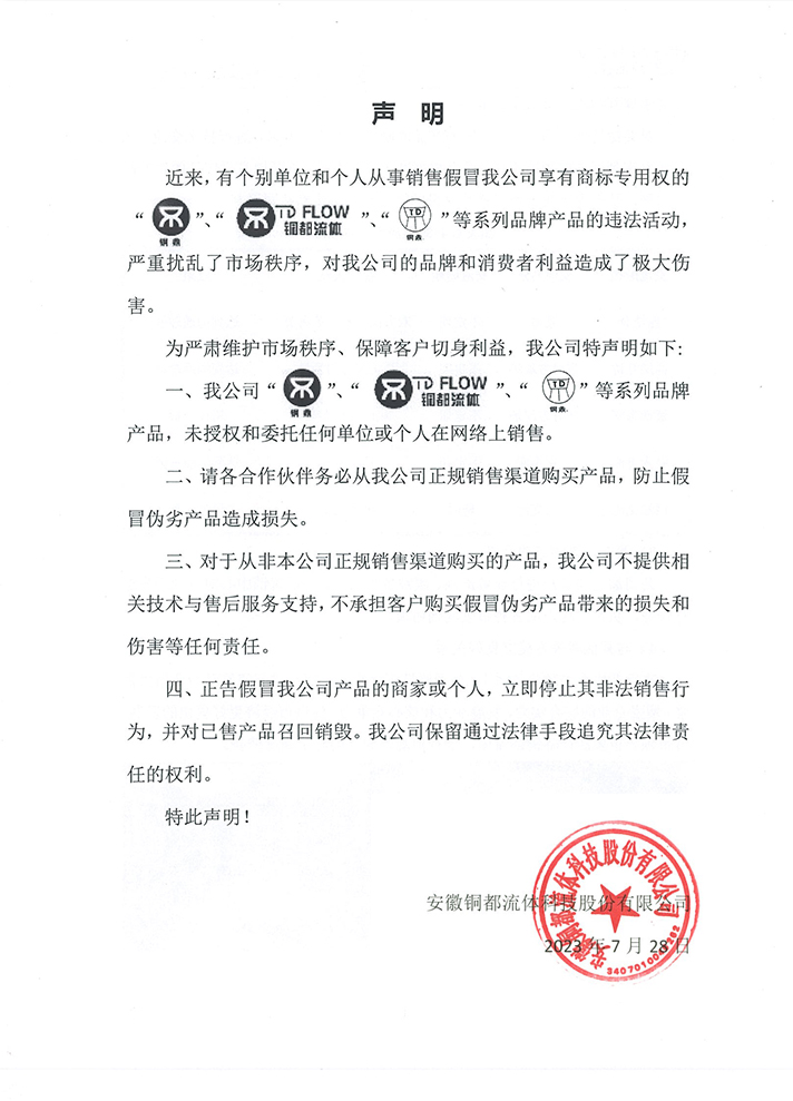 關(guān)于打擊不法銷售假冒偽劣“銅都流體”產(chǎn)品的聲明。