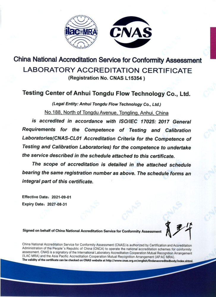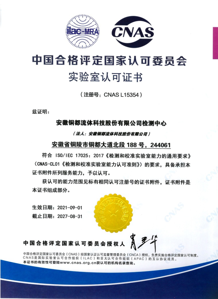 安徽銅都流體科技股份有限公司于近日獲得“中國(guó)合格評(píng)定國(guó)家認(rèn)可委員會(huì)(CNAS)實(shí)驗(yàn)室認(rèn)可證書(shū)”。