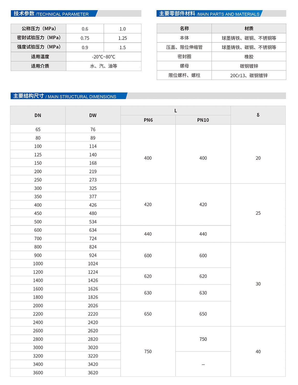 雙法蘭傳力接頭:由本體,密封圈,壓蓋,伸縮短管等主要部件組成。該產品適用于兩邊均為法蘭連接的管道中,安裝時調節(jié)產品兩端的法蘭的安裝長度,對角均勻擰緊壓蓋螺栓,使其成為一個整體,并有一定的調節(jié)量,方便安裝維修時,根據(jù)現(xiàn)場尺寸進行調整。在工作時可以反軸向推力傳遞至整個管道。雙法蘭傳力接頭是由法蘭松套伸縮接頭和短管法蘭,傳力螺桿等構件組成,能降低被連接件的壓力推力(盲板力)和補償管路安裝誤差。雙法蘭傳力接主要用于泵、閥門等附件的松套連接。