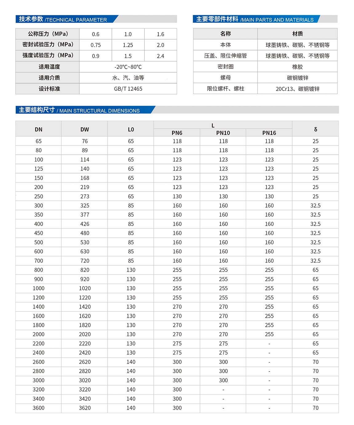 松套限位補(bǔ)償接頭安裝在管道上后,擰緊螺母,起到密封和連接作用。當(dāng)溫度變化時(shí),管子能在接頭中間自由地伸縮,當(dāng)?shù)鼗鲁?、偏斜,它均能確保密封無滲漏,從而達(dá)到自動(dòng)補(bǔ)償之目的。