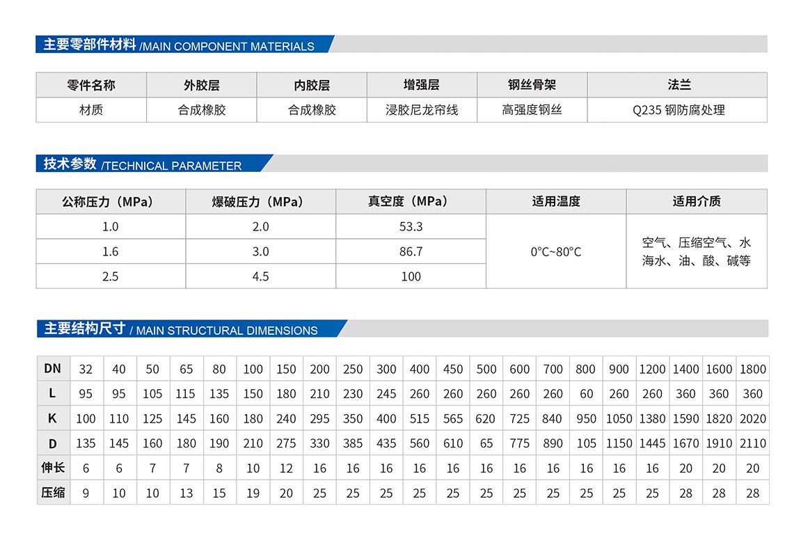 由織物增強的橡膠件,一般由內(nèi)膠層、織物增強層、鋼絲圈、外膠層經(jīng)硫化成橡膠件后與松套金屬法蘭組成,用于管道隔振降噪、補償位移的接頭??裳a償軸向位移、徑向位移和角向位移。具有耐壓高、彈性好、位移量大、平衡管道偏差、吸收振動、降低噪音效果好。