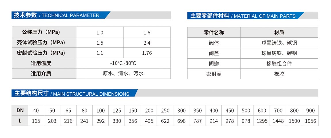 采用全流面積式設計,水頭損失小,不易堆積雜物,密封采用斜板式設計,關閉行程短,閥瓣采用橡膠與鋼板經高溫壓制而成,耐沖涮,密封性能好,產品結構簡單、維護和保養(yǎng)方便。